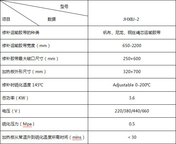 膠帶輸送機械在運行過程中,由于跑偏或輸送機本身質量問題,使膠帶兩邊損壞,影響正常使用,JHXBJ-2型電熱式膠帶修補器,可在停機后較短時間內(一般為3小時)不拆除托輥的情況下,對邊緣損壞處做有效的硫化修補,是一種用途較廣的綜合性修補設備,其性能及操作方法與硫化機相同。